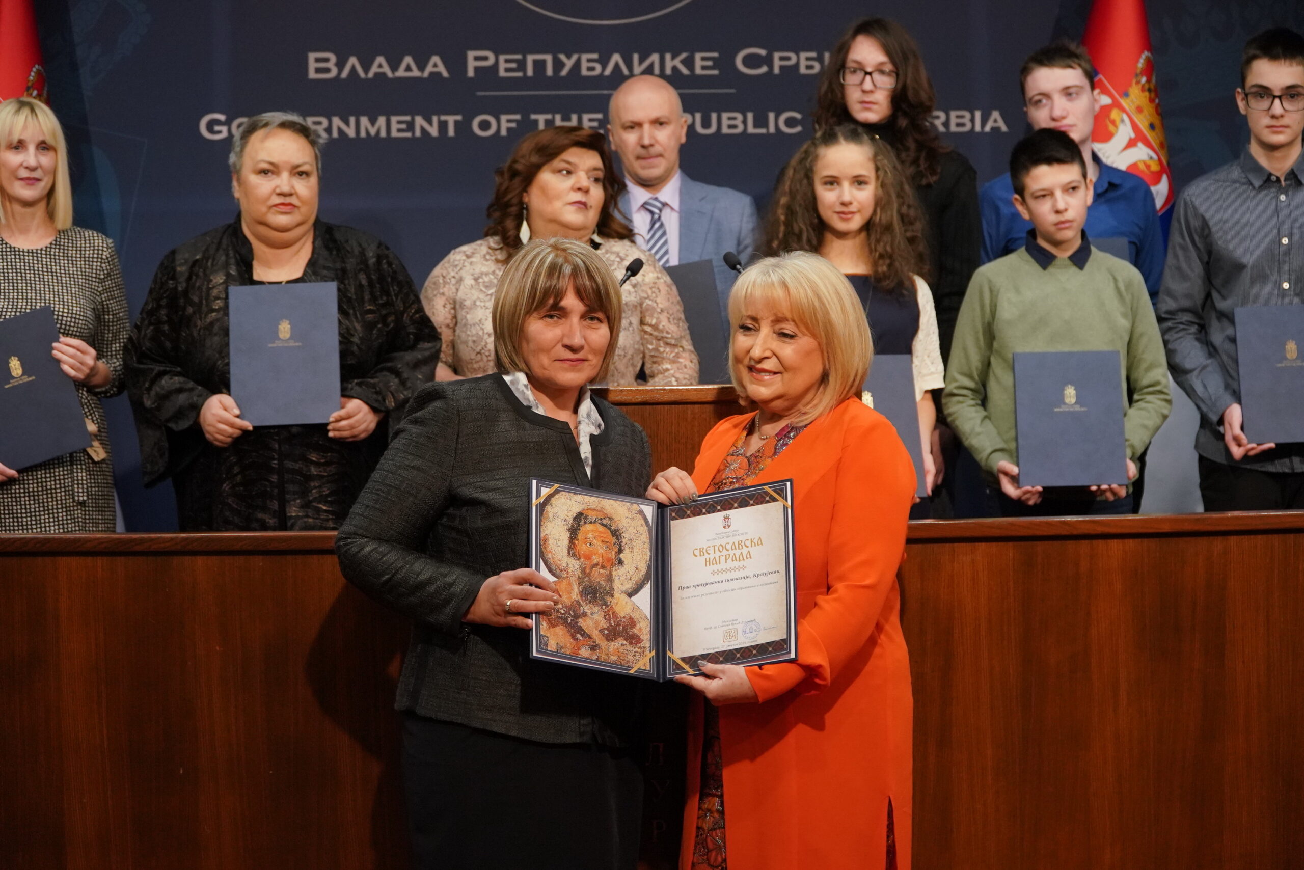 Министарка просвете проф. др Славица Ђукић Дејановић уручила је данас у Влади Србије Светосавске награде за 2023. годину истакнутим појединцима и представницима институција и честитала им на том признању.